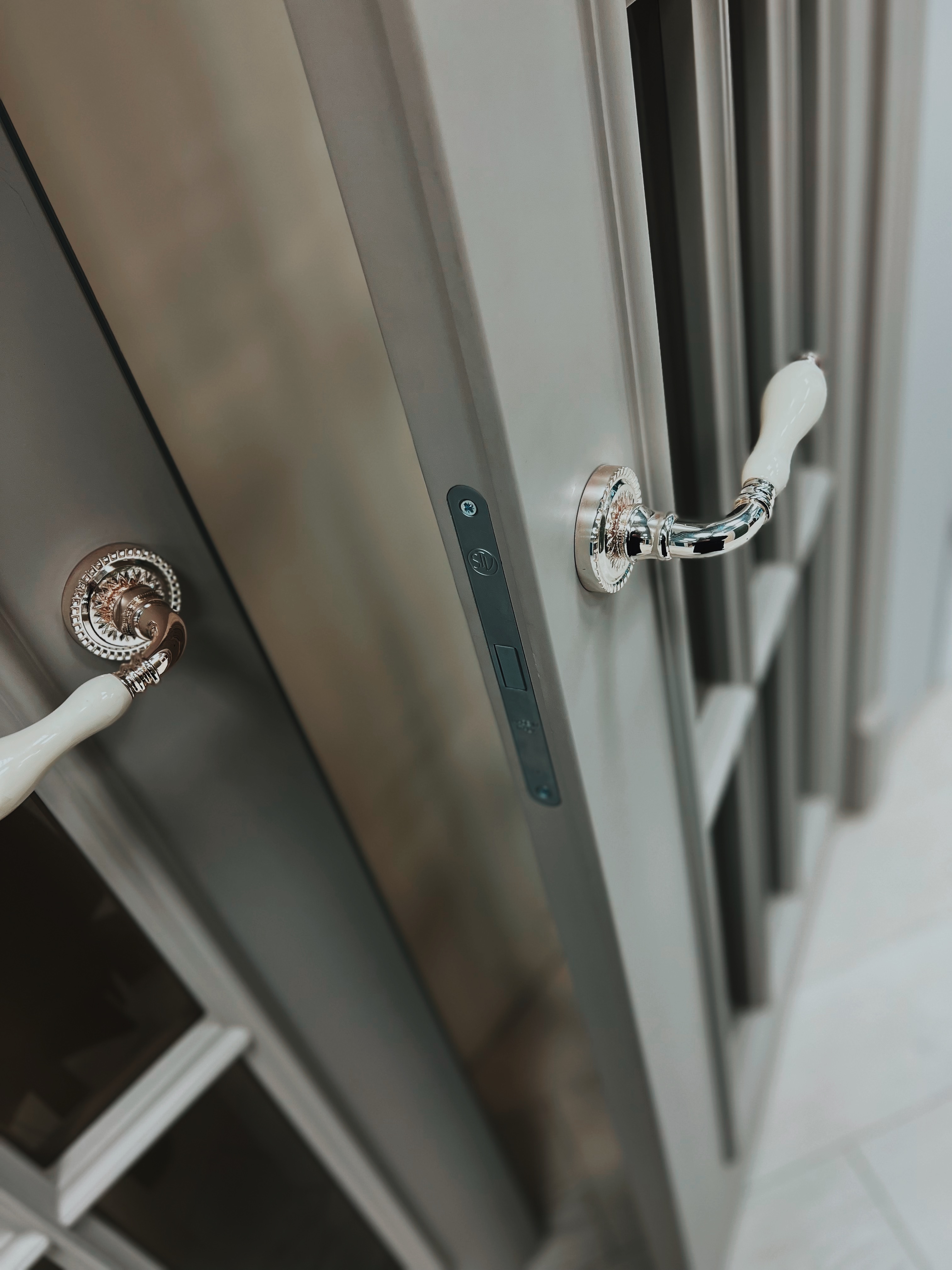 Полотно тамбуратное из инженерного массива (МДФ + ламельный/листельный массив лиственных пород) толщиной 50 мм. с повышенной шумоизоляцией,окра шенное матовыми красками итальянского производства SIRCA с эффектом «soft touch» по шкале RAL с возможностью двусторонней окраски. Объемные филенки, стекла крепятся к полотну с помощью фигурных штапиков (багетов).