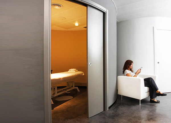 Технология Eclisse позволяет скользить полотну толщиной 40 мм внутри радиусной поверхности благодаря специально разработанным для такой системы двухколесным роликам, которые плавно двигаются вдоль изгиба любого радиуса.