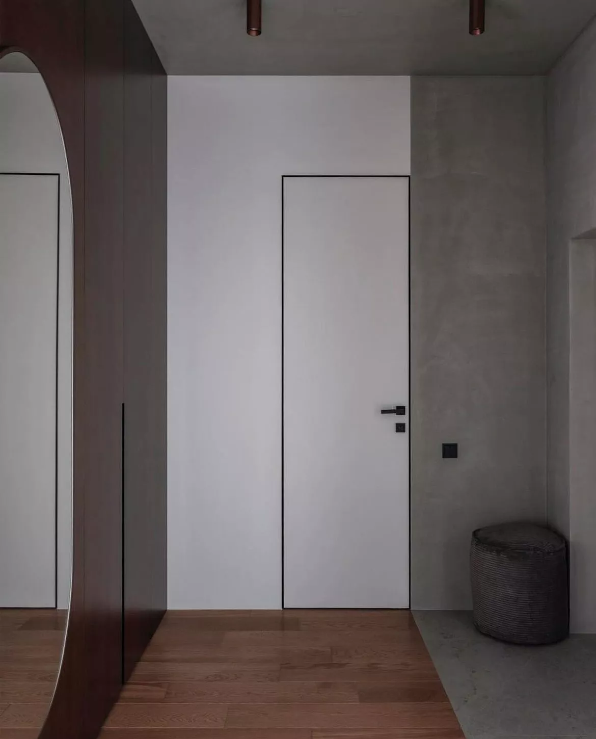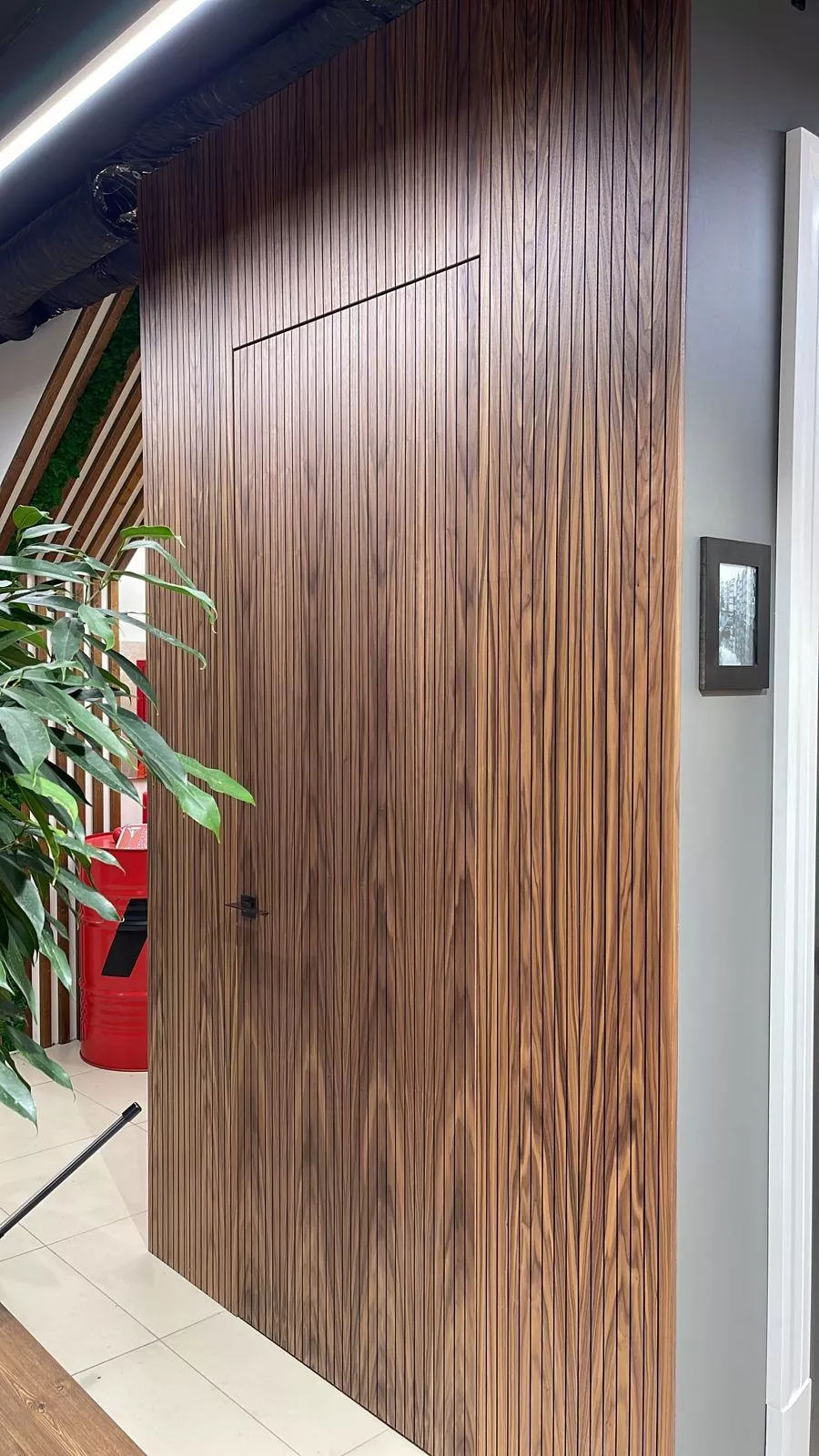• Скрытые (невидимые): двери, которые сливаются со стеной – за счет идентичной отделки (окрашивание по палитрам RAL или NCS на производстве или отделка на объекте в материал, идентичный материалу стены) или стеновых панелей (накладки в единой плоскости с полотном, в идентичном цвете и фрезеровке).