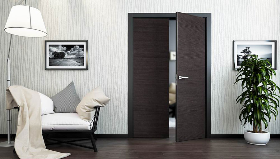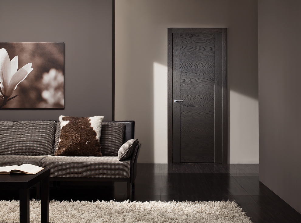 2. с брашированием. Межкомнатная дверь из чёрного ясеня в полной мере раскрывает своё естественное очарование в результате ручной обработки металлическими щётками. Верхний слой древесины снимается, благодаря чему «живой» рисунок породы звучит ярче. Такая техника сочетается и с историческими, и с минималистками изделиями;