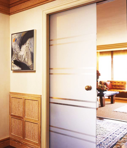 - открываются раздвижным способом – полотна скользят параллельно стене или прячутся в полости внутри неё. Встроенная дверь – наиболее компактный вариант перекрытия прохода, освобождающий всю площадь вокруг него;