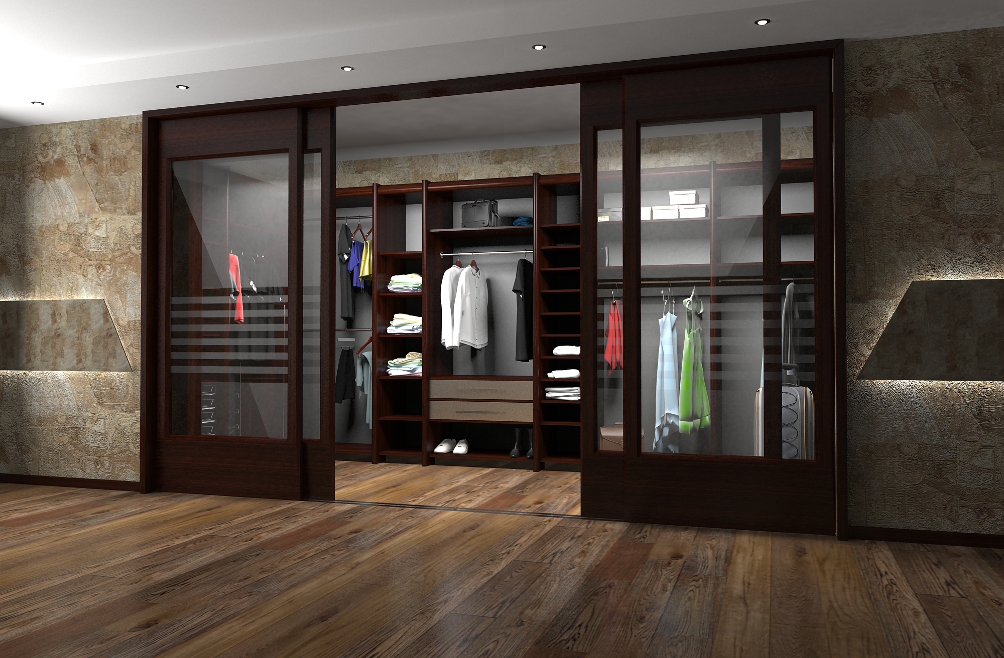 - просто обеспечить удобный доступ к полкам или создать полноценное помещение для хранения одежды и переодевания;